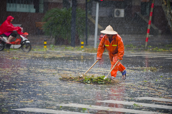 暴雨中,城區(qū)大街小巷雨水橫流,部分主次干道積水嚴重。環(huán)衛(wèi)工人冒著大雨,不顧汽車濺起的臟水,積極清理和疏通路面積水,確保大街小巷排水暢通。許多低洼路段的環(huán)衛(wèi)工更充當起排水工。