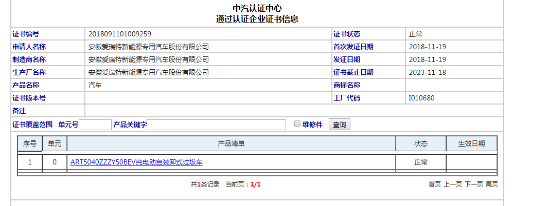 近期,經(jīng)中汽認(rèn)證中心認(rèn)證,安徽愛瑞特新能源專用汽車股份有限公司(以下簡(jiǎn)稱愛瑞特)旗下ART5040ZZZY50BEV車型通過強(qiáng)制性產(chǎn)品認(rèn)證,即國(guó)家3C認(rèn)證,取得了該領(lǐng)域市場(chǎng)的準(zhǔn)入資格。這標(biāo)志著愛瑞特研發(fā)的新能源環(huán)衛(wèi)專用汽車在新能源汽車行業(yè)前進(jìn)了一大步,正式邁入批量生產(chǎn)、投放市場(chǎng)階段。ART5040ZZZY50BEV型純電動(dòng)自裝卸式垃圾車節(jié)能減排、經(jīng)濟(jì)實(shí)用、操控簡(jiǎn)單,起步快行駛穩(wěn)定,噪音低安全性高,既為城市垃圾清潔行業(yè)降低了運(yùn)營(yíng)成本,又減少了城市空氣污染指數(shù);既提升了城市居民的生活質(zhì)量,又推進(jìn)了綠色城市的健康建設(shè)。